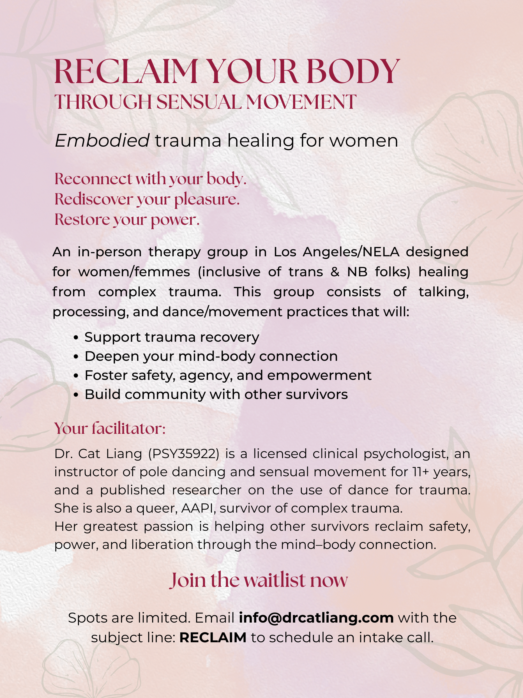 Dance and sensual movement have been one of the most transformative tools in my own healing journey. Through dance, I learned how to connect my mind and body, feel more safe in my own skin, and reclaim my sexuality, sensuality, and power. Dance showed me that embodiment isn’t just possible after trauma—it can be joyful. And that power lives in all of us.